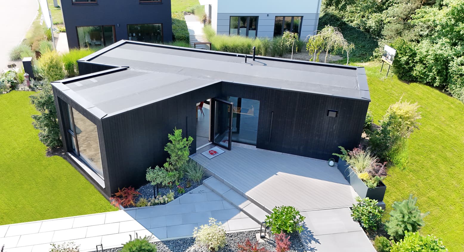 Het hart van het huis is de ongeveer 30 m² grote woonruimte met een open keuken en eetgedeelte. Royale panoramaramen laten veel daglicht binnen en bieden een vrij uitzicht – perfect voor ontspannen vakantiedagen en gezellige avonden.