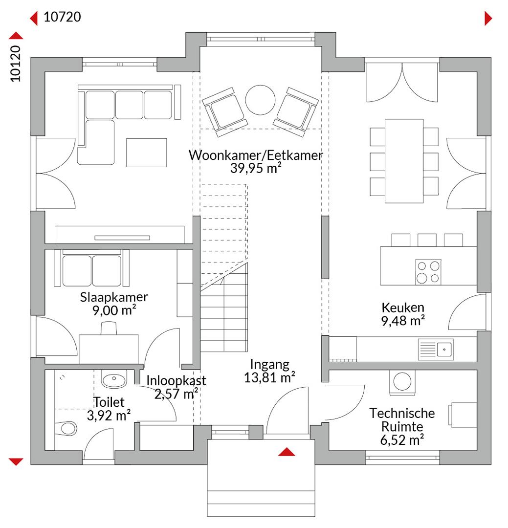 Anderhalf verdiepingen tellend huis met vijf slaapkamers, inloopkast, open keuken, badkamer, gastentoilet, entreehal, gang, garderobe en technische ruimte. Zadeldak met een dakhelling van 30°. Knieschothoogte: 1,75 m.
