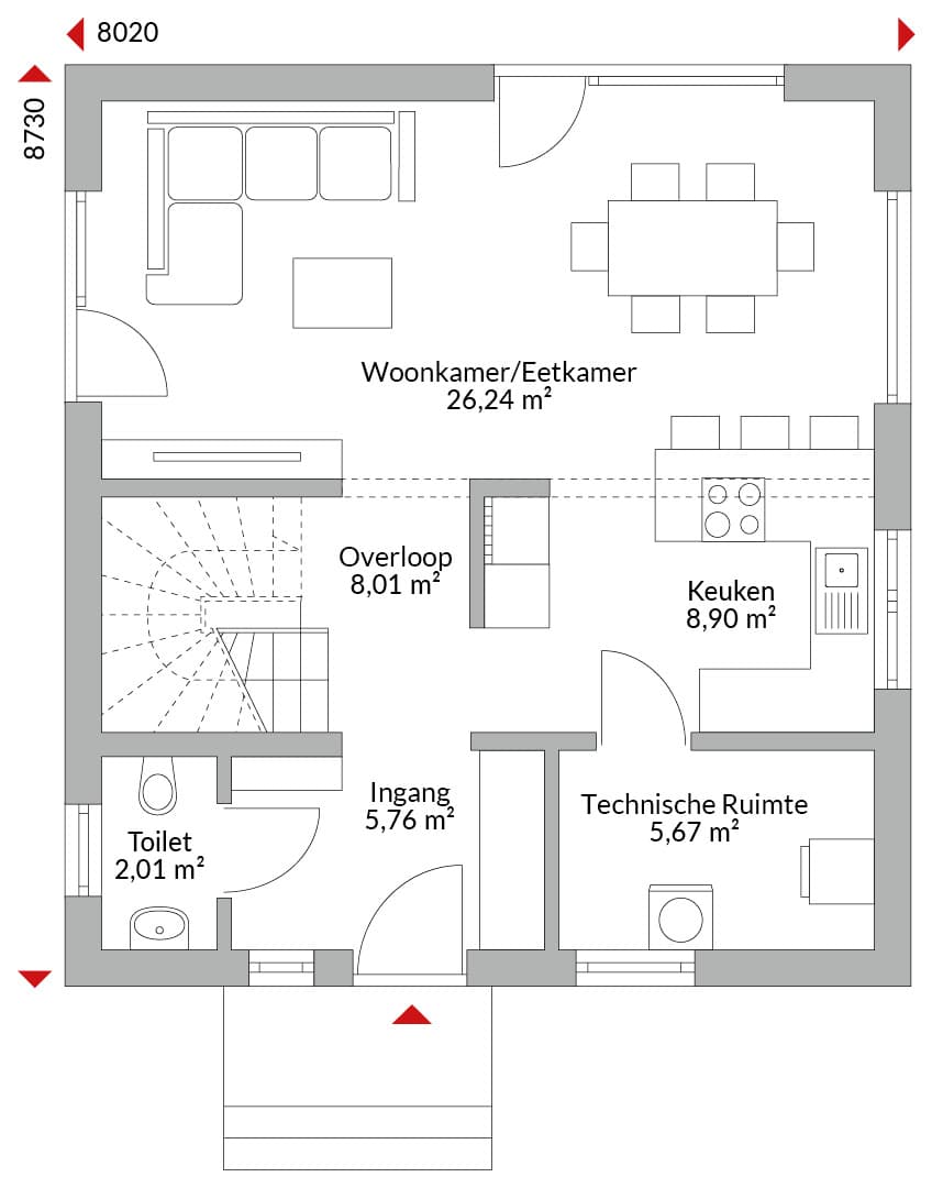 Anderhalf verdiepingen tellend huis met vier slaapkamers, open keuken, badkamer, gastentoilet, entreehal, gang en technische ruimte. Zadeldak met een dakhelling van 40°. Knieschothoogte: 1,00 m.