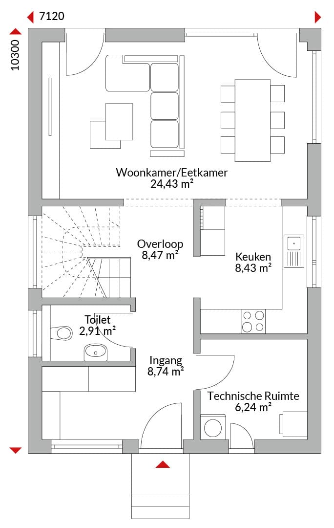 Anderhalf verdiepingen tellend huis met vier slaapkamers, inloopkast, open keuken, badkamer, gastentoilet, entreehal, gang en technische ruimte. Zadeldak met een dakhelling van 30°. Knieschothoogte: 1,75 m.
