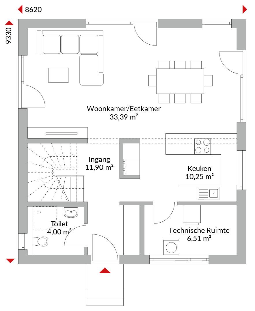 Anderhalf verdiepingen tellend huis met vier slaapkamers, open keuken, badkamer, gastentoilet, technische ruimte en entreehal. Zadeldak met een dakhelling van 40°. Knieschothoogte: 0,75 m.