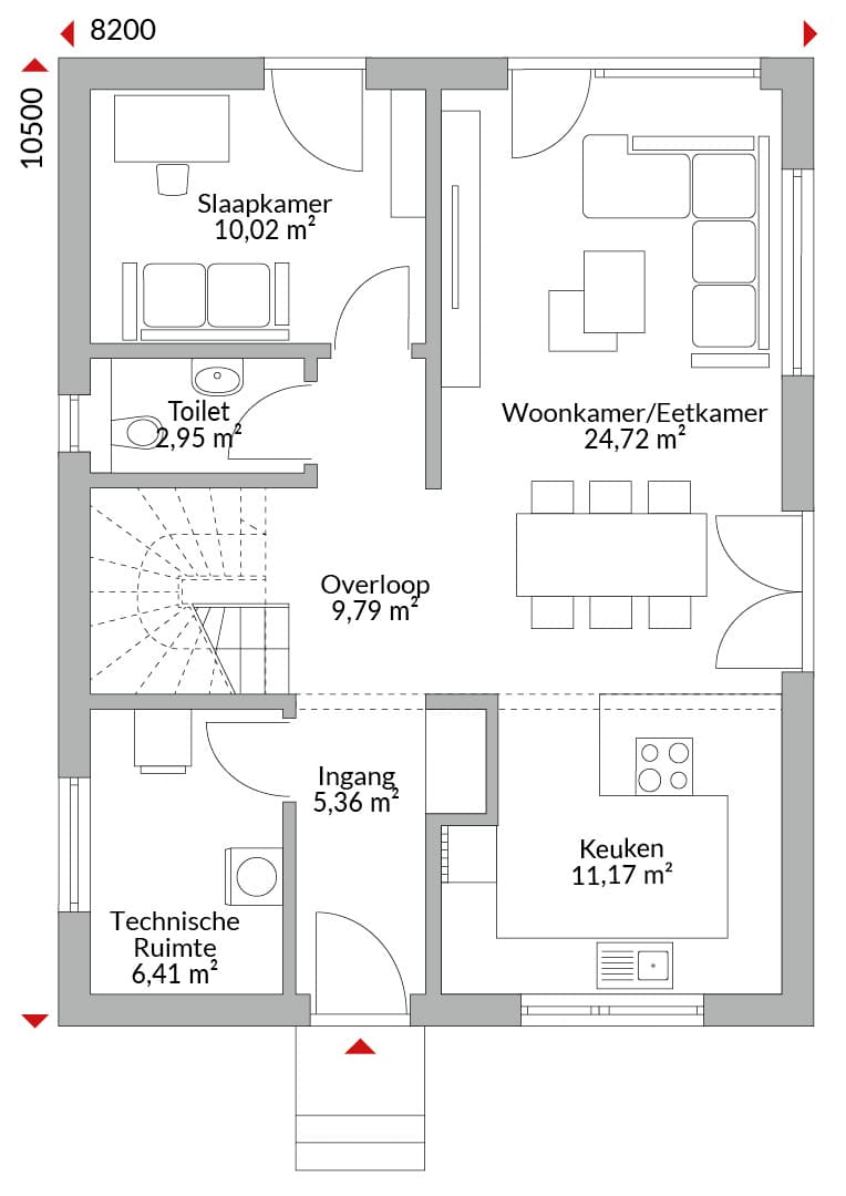 Anderhalf verdiepingen tellend huis met vijf slaapkamers, inloopkast, open keuken, badkamer, gastentoilet, entreehal, gang en technische ruimte. Zadeldak met een dakhelling van 40°. Knieschothoogte: 1,25 m.