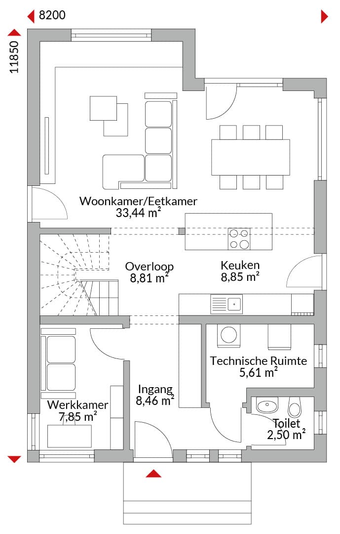 Anderhalf verdiepingen tellend huis met vijf slaapkamers, inloopkast, open keuken, badkamer, gastentoilet, entreehal, gang en technische ruimte. Zadeldak met een dakhelling van 30°. Knieschothoogte: 1,75 m.