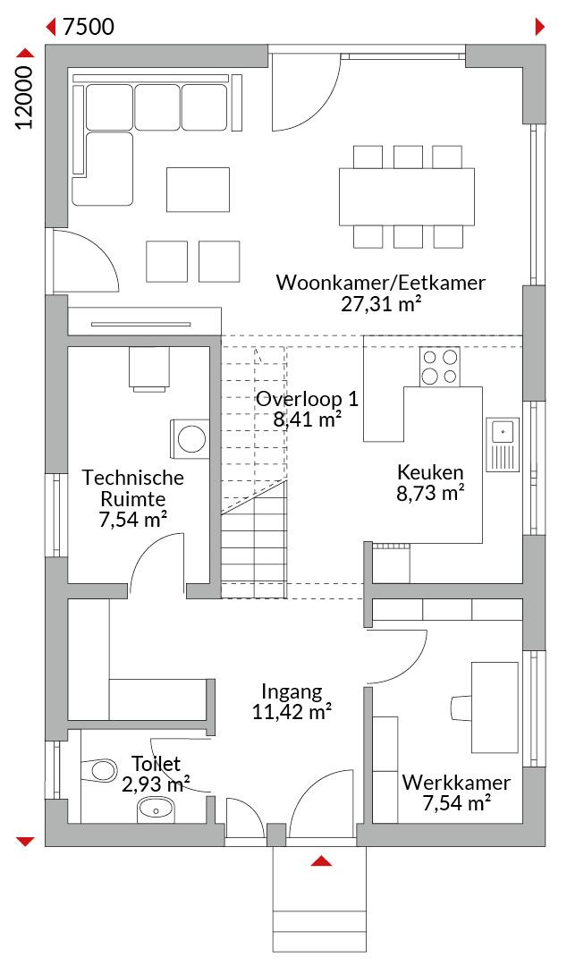 Anderhalf verdiepingen tellend huis met vier slaapkamers, inloopkast, studeerkamer, open keuken, twee badkamers, gastentoilet, entreehal, gang en technische ruimte. Zadeldak met een dakhelling van 30°. Knieschothoogte: 1,75 m.