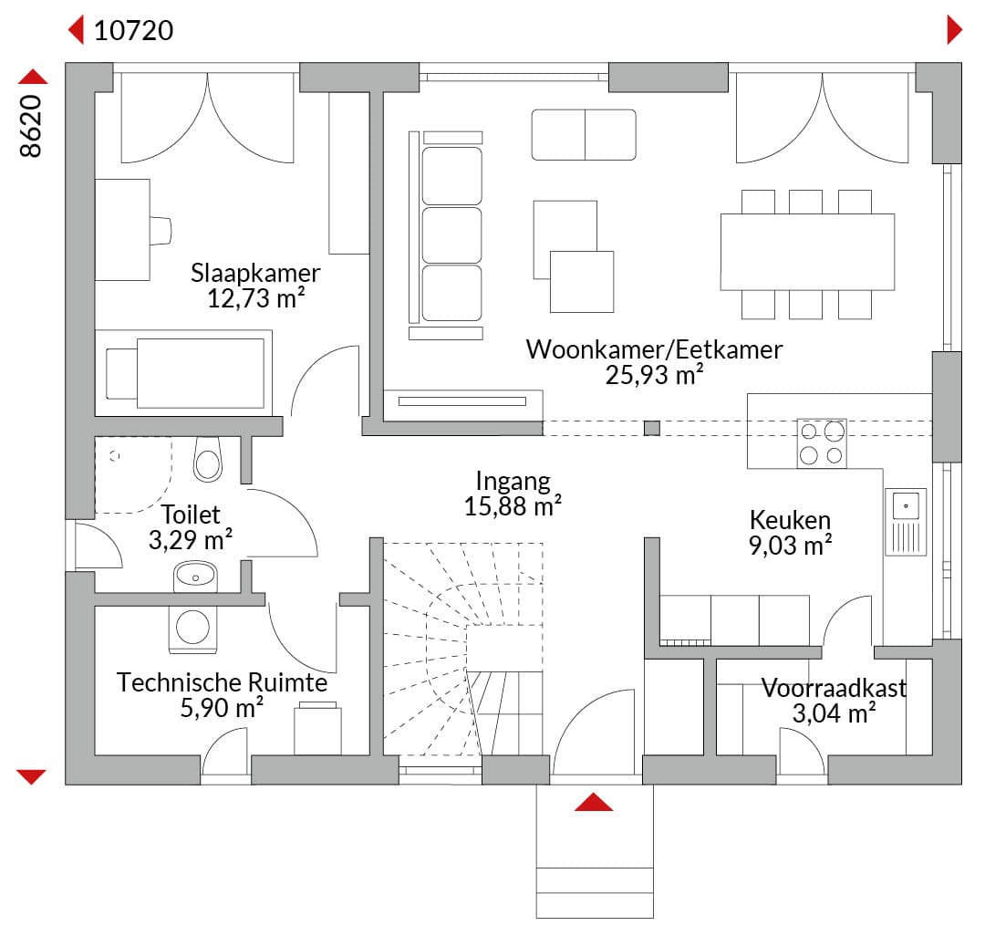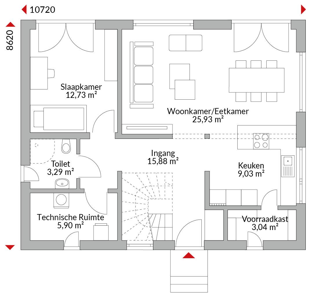 Anderhalf verdiepingen tellend huis met twee dwarskappen, vijf slaapkamers, inloopkast, open keuken, voorraadkast, badkamer, gastentoilet, technische ruimte en entreehal. Zadeldak met een dakhelling van 40° (dwarskappen 35°). Knieschothoogte: 1,00 m.