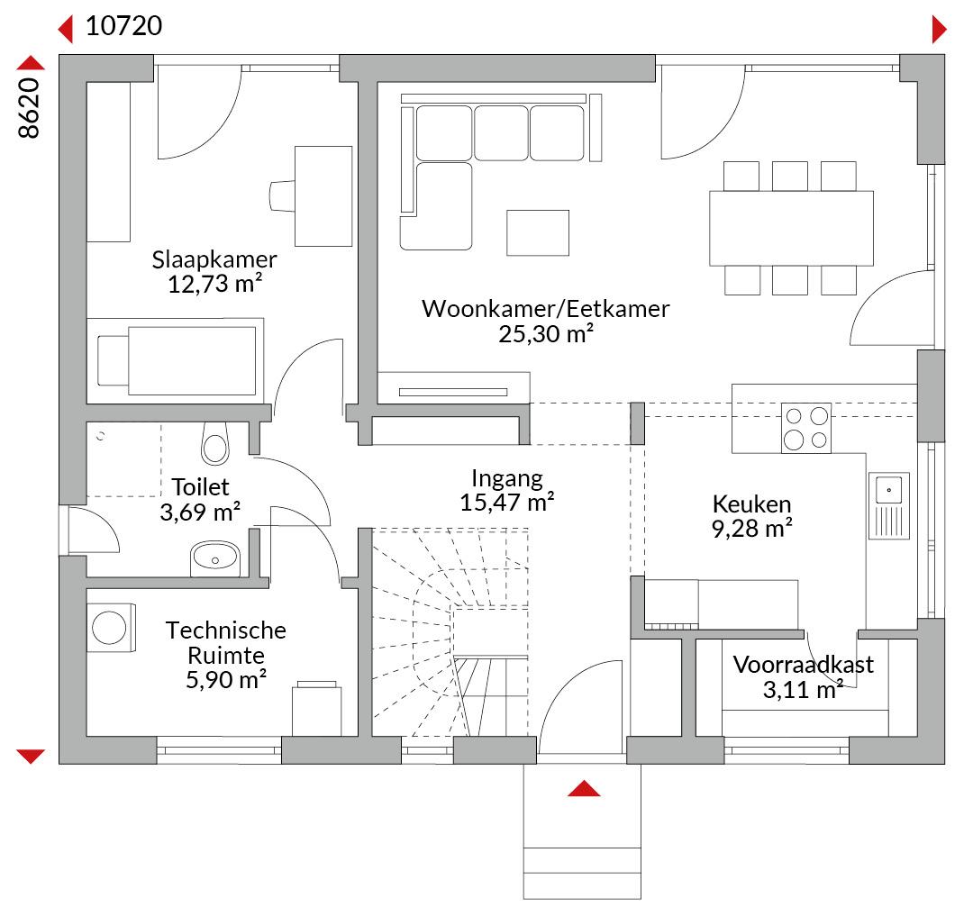 Anderhalf verdiepingen tellend huis met zes slaapkamers, open keuken, voorraadkast, badkamer, gastentoilet, entreehal, gang en technische ruimte. Zadeldak met een dakhelling van 40°. Knieschothoogte: 0,75 m.