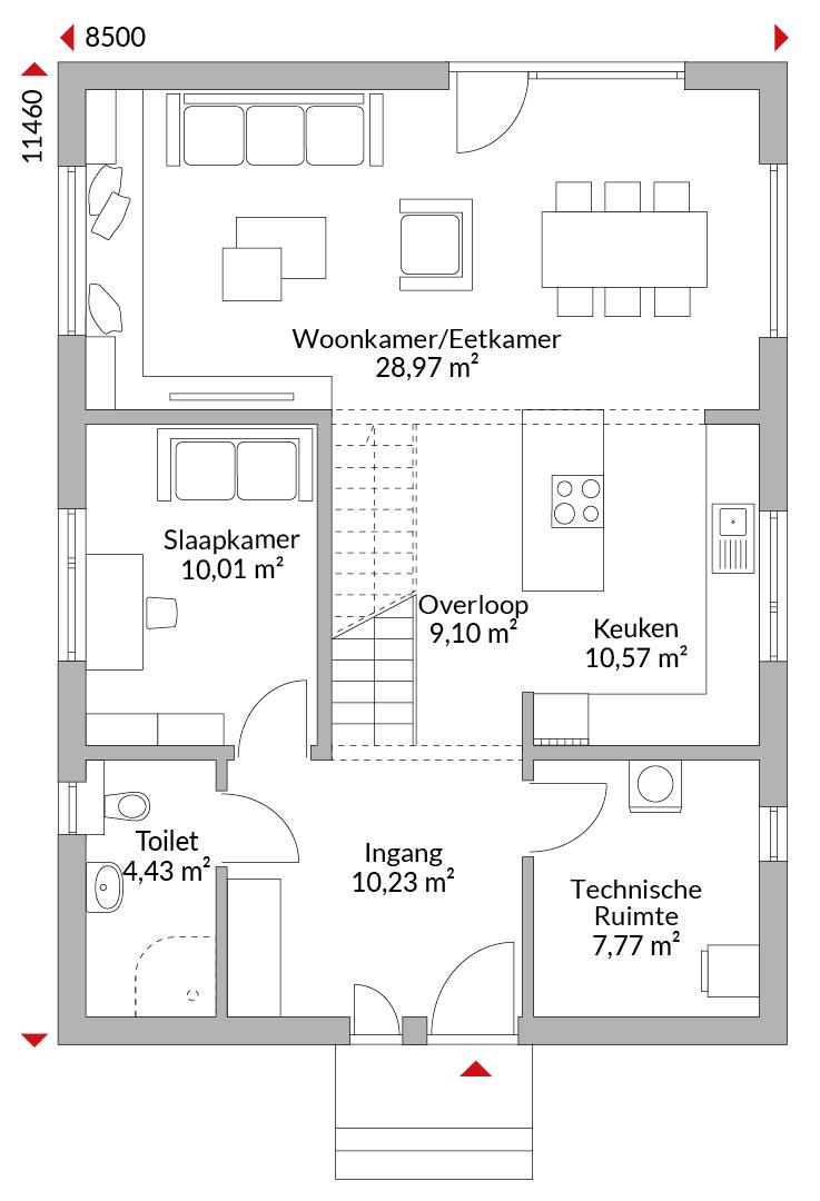 Anderhalf verdiepingen tellend huis met zes slaapkamers, inloopkast, open keuken, badkamer, gastentoilet, technische ruimte en entreehal. Zadeldak in zolderstijl met een dakhelling van 30°. Knieschothoogte: 1,50 m.