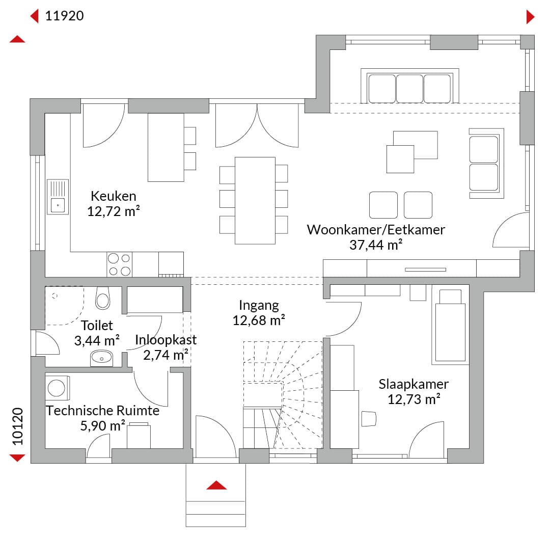 Anderhalf verdiepingen tellend huis met vier slaapkamers, open keuken, badkamer, gastentoilet, technische ruimte en entreehal. Zadeldak met een dakhelling van 25°. Knieschothoogte: 1,75 m.