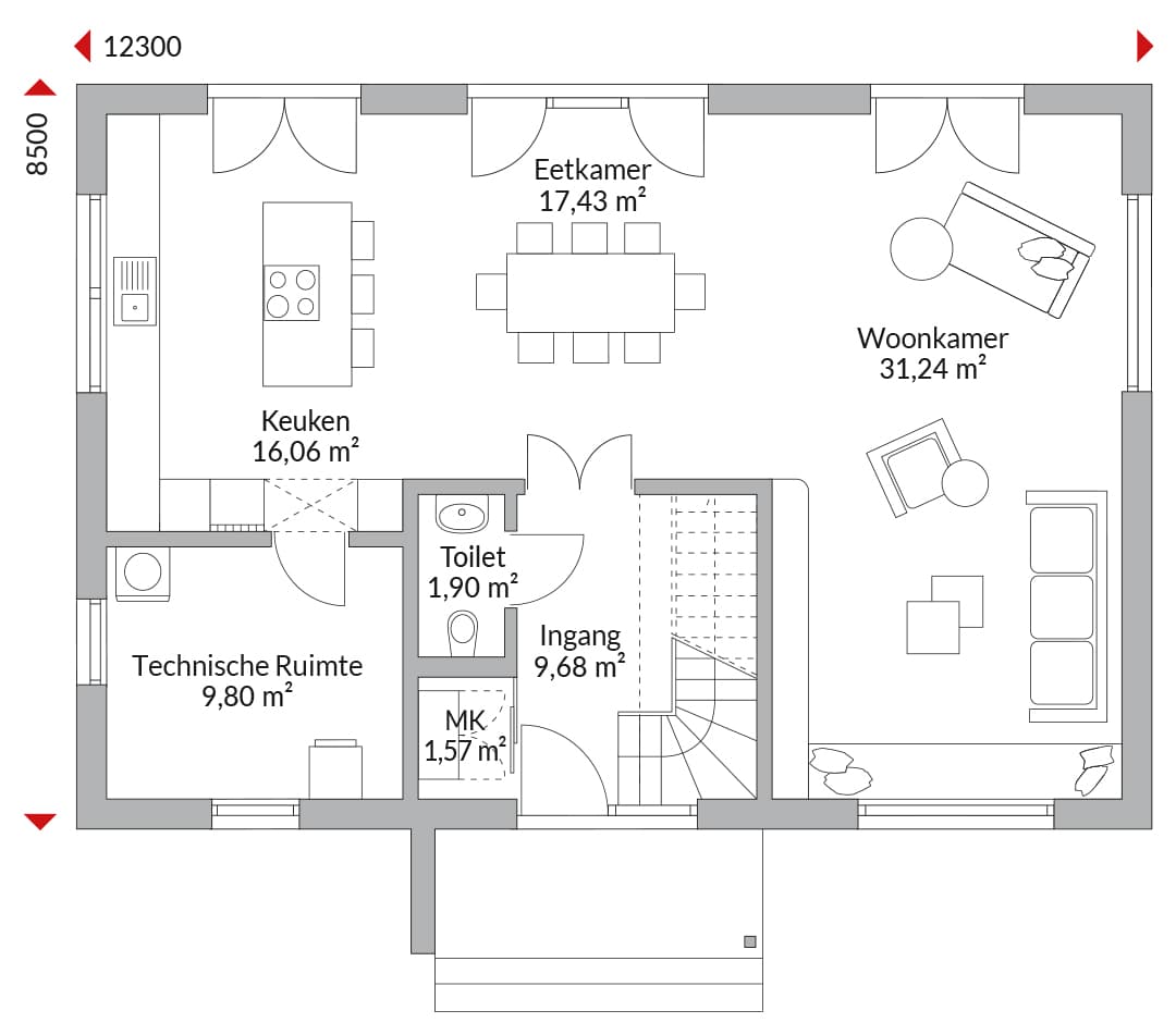 Anderhalf verdiepingen tellend huis met vijf slaapkamers, inloopkast, open keuken, badkamer, gastentoilet, entreehal, gang, garderobe en technische ruimte. Zadeldak met een dakhelling van 30°. Knieschothoogte: 1,75 m.