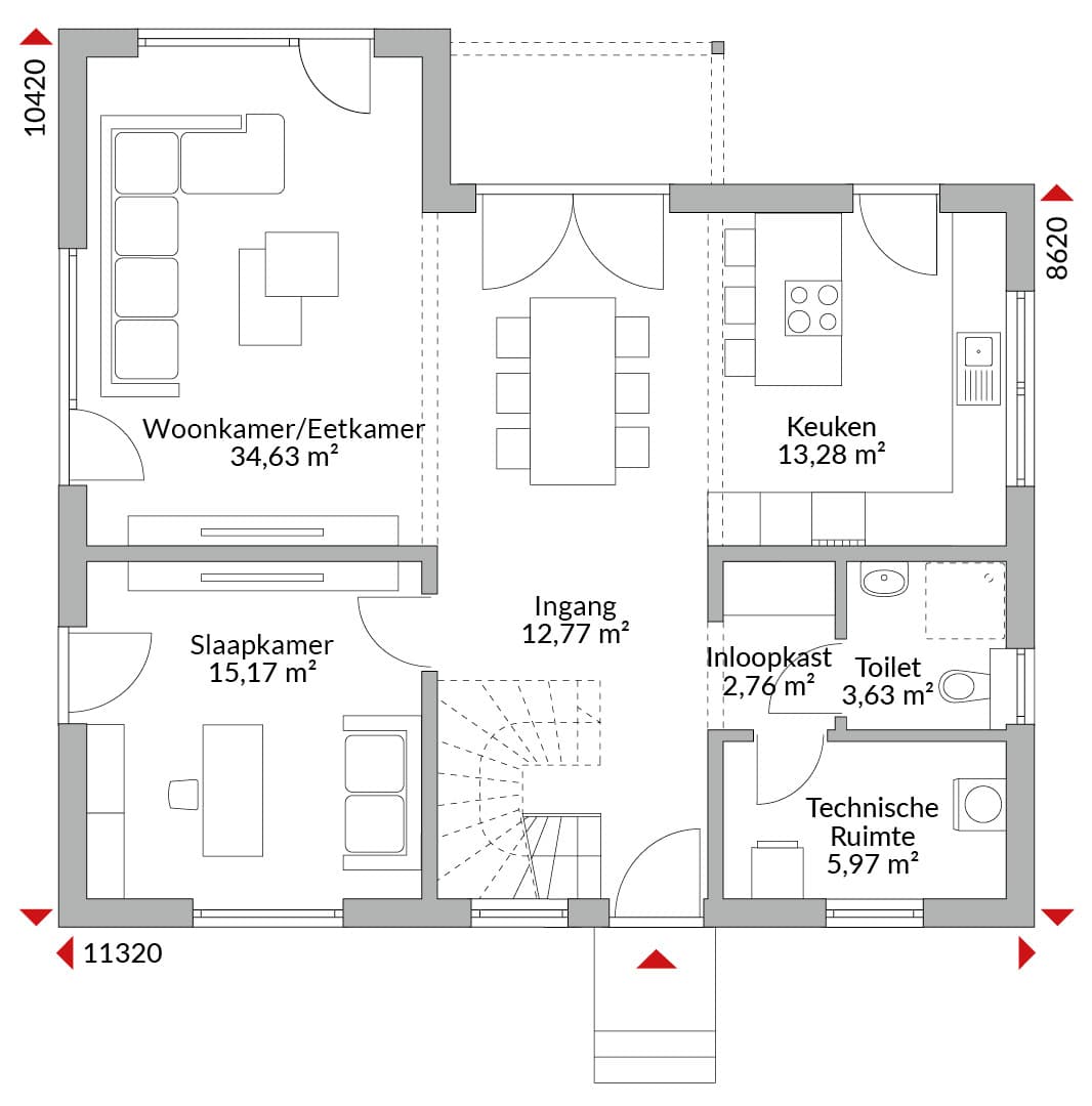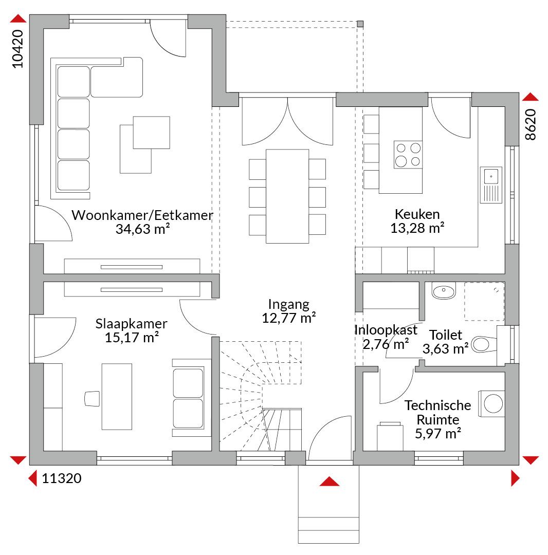 Anderhalf verdiepingen tellend drie-kap huis met vijf slaapkamers, inloopkast, open keuken, badkamer, gastentoilet, entreehal, gang en technische ruimte. Zadeldak met een dakhelling van 40°. Knieschothoogte: 0,75 m. inclusief terrasoverkapping.