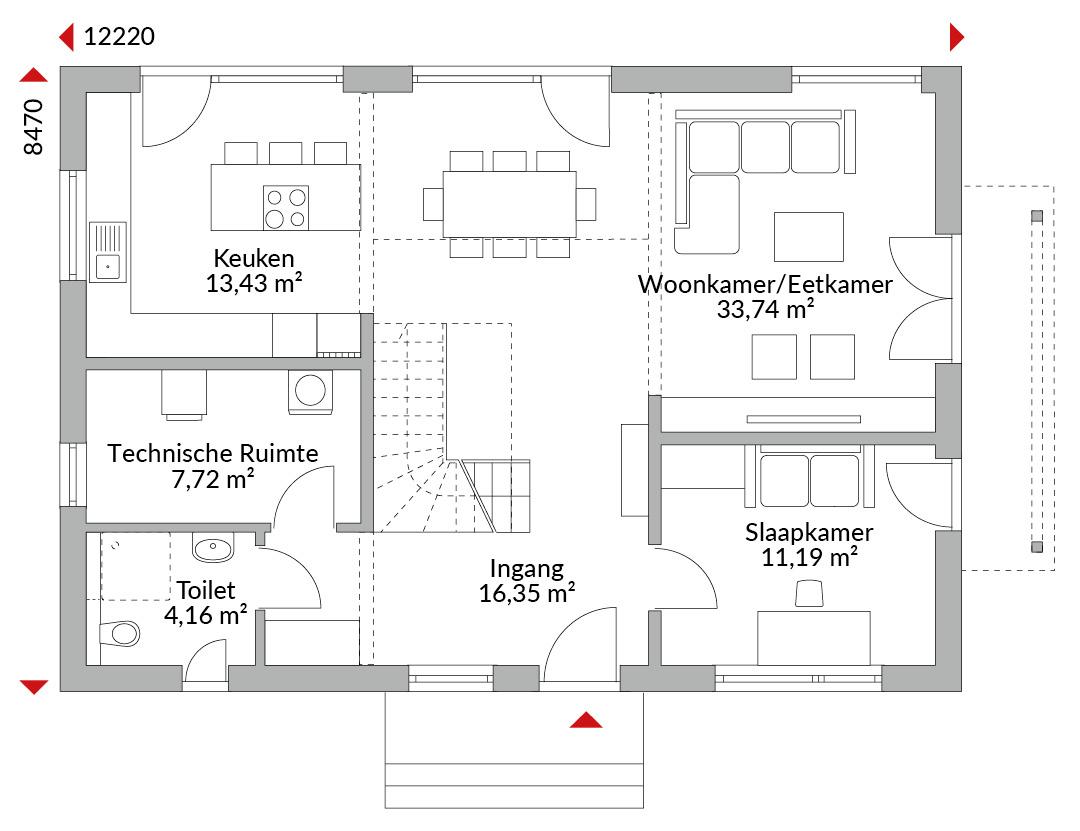 Anderhalf verdiepingen tellend huis met vijf slaapkamers, inloopkast, open keuken, badkamer, gastentoilet, technische ruimte en entreehal met dubbele hoogte. Zadeldak met een dakhelling van 25°. Knieschothoogte: 2,00 m. Inclusief balkon.