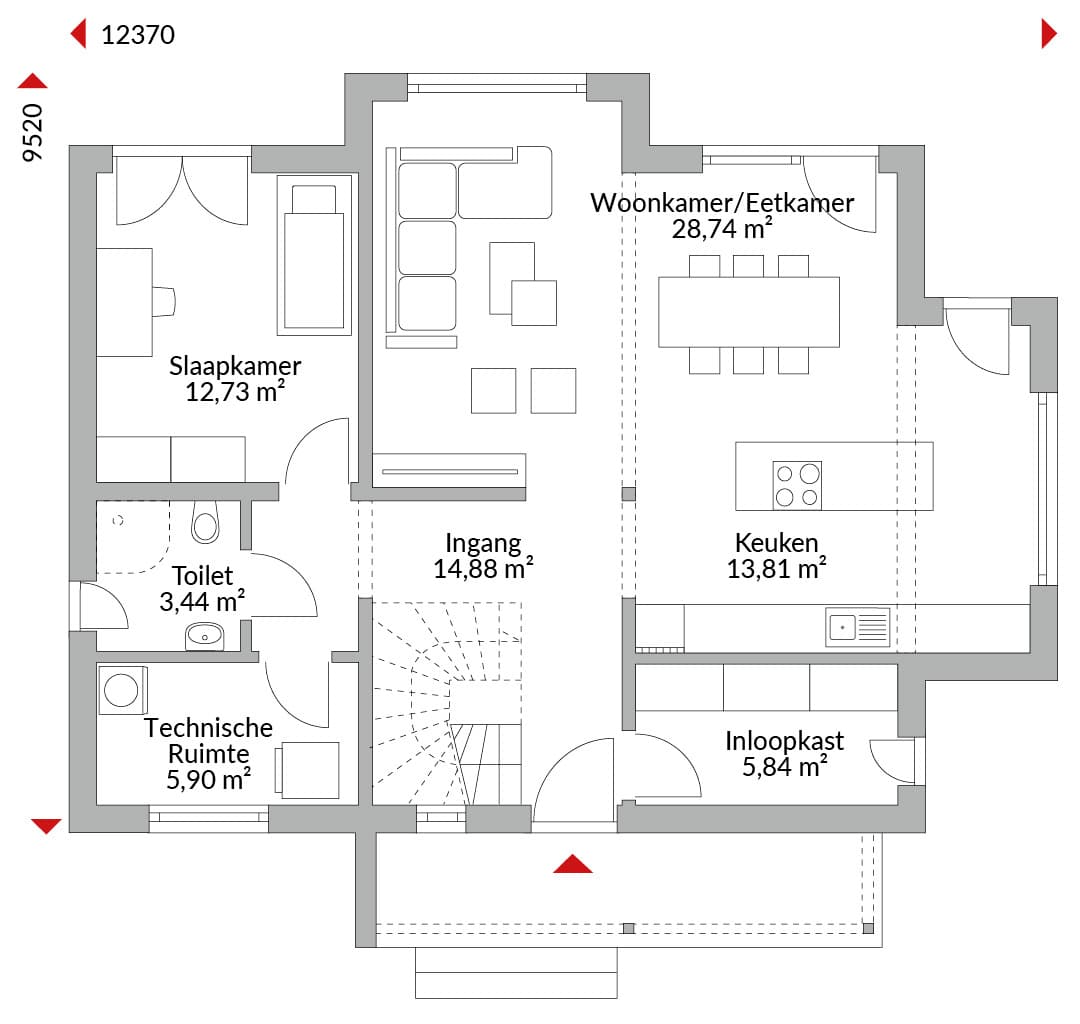 Anderhalf verdiepingen tellend huis met vijf slaapkamers en een studeerkamer, dwarskap, erker, balkon, entreeoverkapping met plat dak, open keuken, badkamer, gastentoilet, technische ruimte en entreehal. Zadeldak met een helling van 25° (dwarskap 25°). Knieschothoogte: 1,75 m.