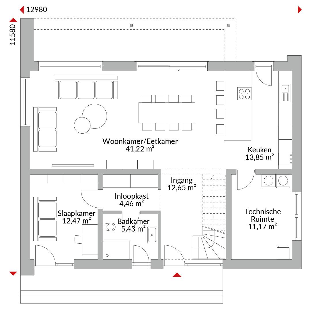 Anderhalf verdiepingen tellend huis met een entreeoverkapping boven de verhoogde voorgevel; entree met trap; open woon-/eetruimte met schuifdeuren naar het terras; keuken met kookeiland aan een wand (peninsula-opstelling); technische ruimte; eenpersoonskamer of studeerkamer met inloopkast en en-suite doucheruimte; hoofdslaapkamer op de bovenverdieping met inloopkast en en-suite badkamer met dubbele wastafel; twee eenpersoonskamers; familiebadkamer; zadeldak met een dakhelling van 38°; knieschothoogte: 1,75 meter.