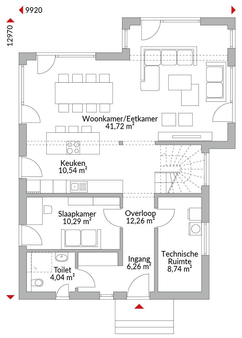 Anderhalf verdiepingen tellend huis met vijf slaapkamers, inloopkast, open keuken, badkamer, gastentoilet, technische ruimte, entreehal en gang. Zadeldak met een dakhelling van 35°. Knieschothoogte: 1,75 m.