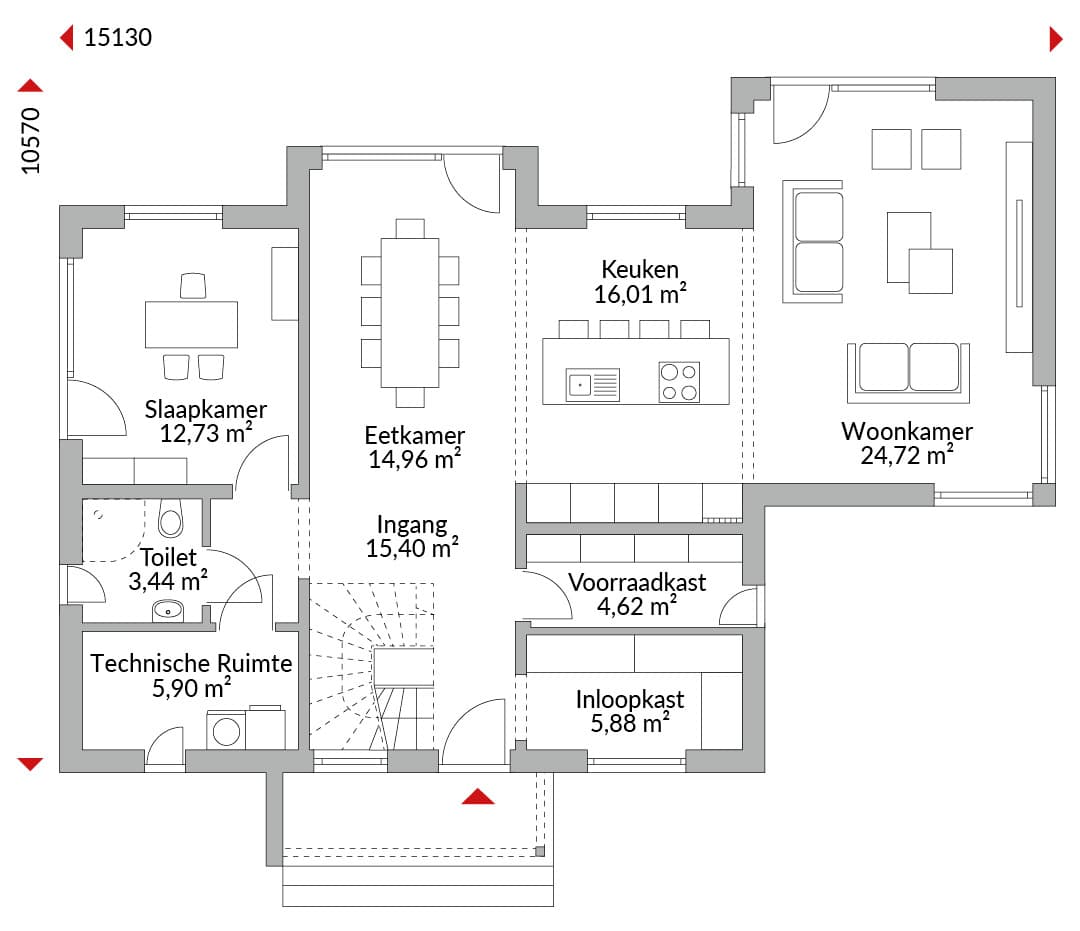 Anderhalf verdiepingen tellend huis met vijf slaapkamers en een studeerkamer, gable met plat dak, aanbouw, entreeoverkapping met plat dak, grote garderobe, open keuken, voorraadkast, badkamer, gastentoilet, technische ruimte en entreehal. Zadeldak met een dakhelling van 25° (plat zadeldak 0°). Knieschothoogte: 1,75 m.