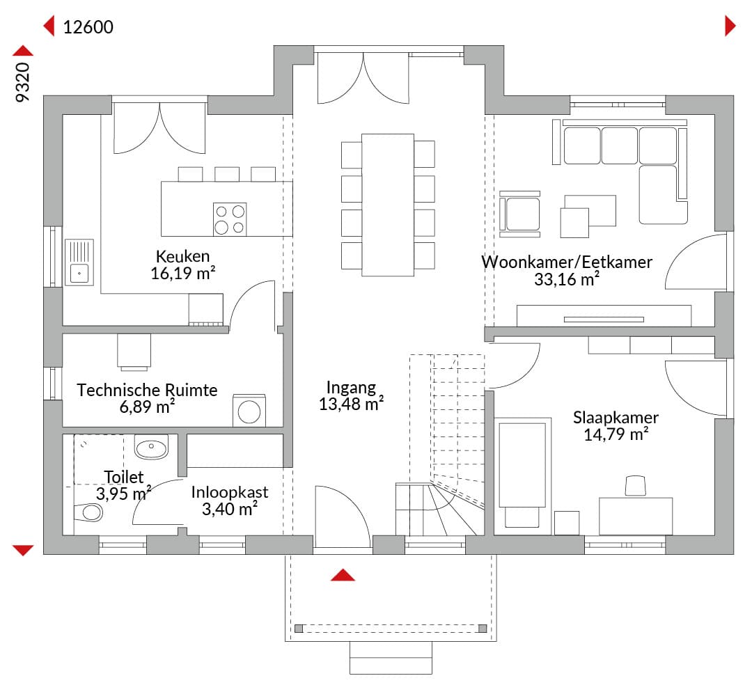 Anderhalf verdiepingen tellend huis met zes slaapkamers, open keuken, badkamer, gastentoilet, technische ruimte, entreehal, garderobe en extra dwarskap. Zadeldak met een dakhelling van 40°. Knieschothoogte: 1,00 m. Inclusief dwarskap, balkon en entreeoverkapping.
