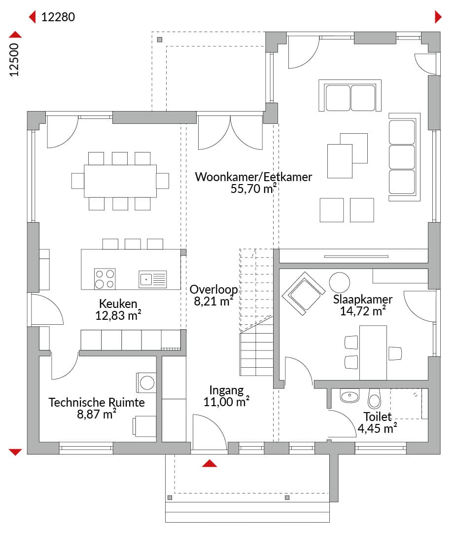 Anderhalf verdiepingen tellend huis met zes slaapkamers, twee inloopkasten, open keuken, badkamer, gastentoilet, technische ruimte, entreehal en gang. Zadeldak met een dakhelling van 25°. Knieschothoogte: 1,75 m.