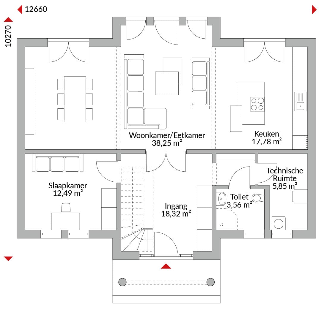 Twee verdiepingen tellend huis met vier slaapkamers, open keuken, ruime woon-/eetkamer, gastentoilet, technische ruimte en entreehal. Badkamer en twee inloopkasten op de bovenverdieping. Schilddak met een dakhelling van 22°.