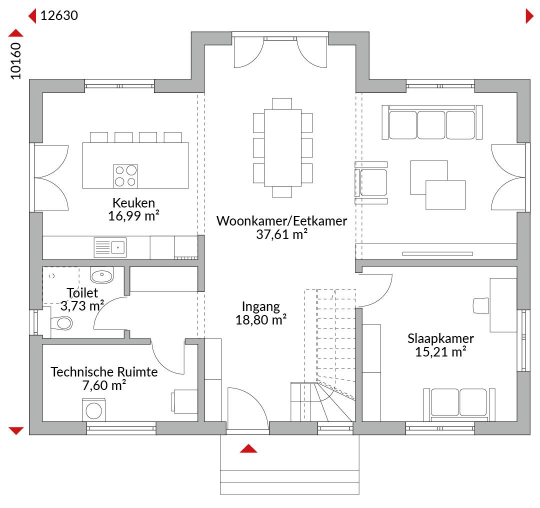 Twee verdiepingen tellend huis met vijf slaapkamers, open keuken, ruime woon-/eetkamer, gastentoilet, technische ruimte en entreehal. Badkamer en inloopkast op de bovenverdieping. Schilddak met een dakhelling van 22°.