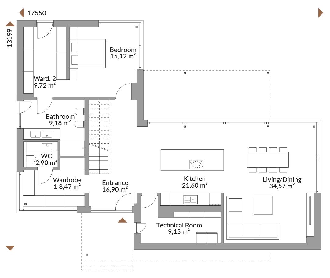 Er zit iets majestueus in dit schitterende gebouw. De centrale structuur torent overal bovenuit, bijna alsof ze zweeft. Dit geeft de architectuur een gevoel van lichtheid en harmonie, terwijl het ook de praktische elementen onthult van de overdekte entree en het terras.