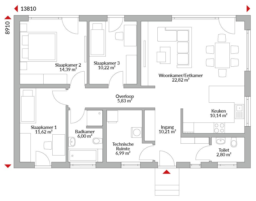 Drieslaapkamerbungalow met hal, open woon-/eet-/keukenruimte, badkamer met douche, apart toilet, technische ruimte en zadeldak met een dakhelling van 25°.