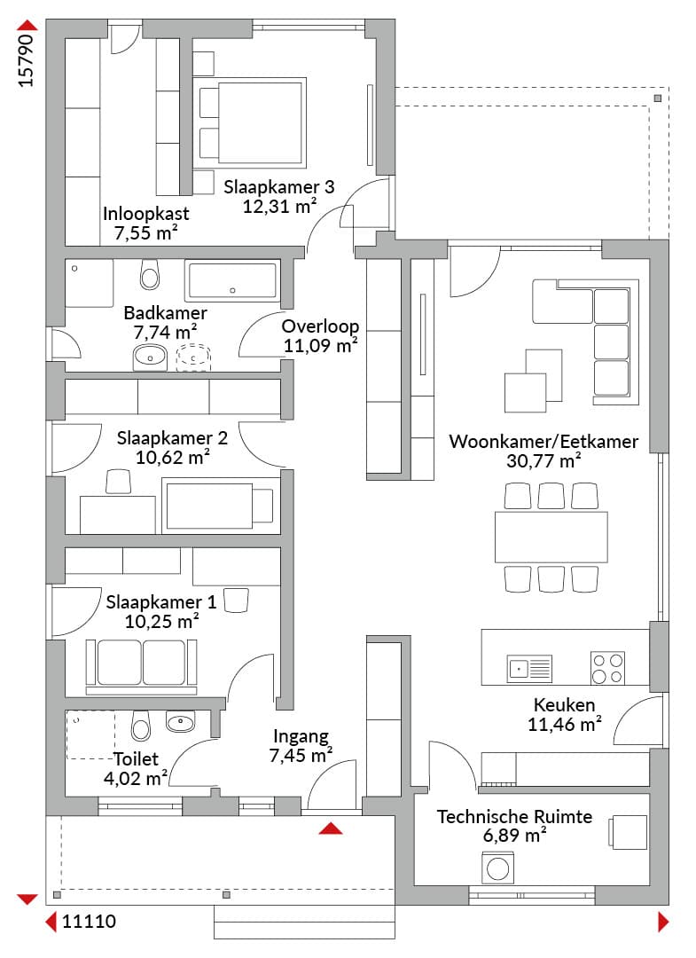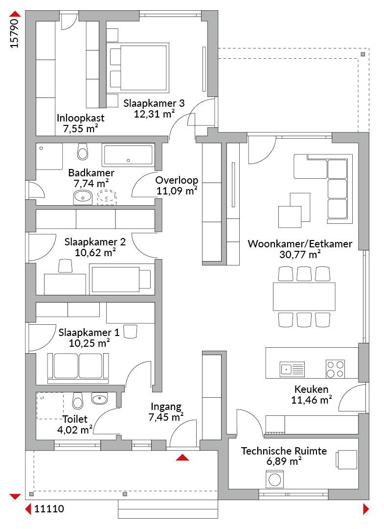 Drieslaapkamer L-vormige bungalow met inloopgarderobe, open keuken, twee badkamers, gastentoilet, voorraadkast, technische ruimte, gang en ruime entree. Plat dak met geïntegreerde overkapping bij de entree en het terras.