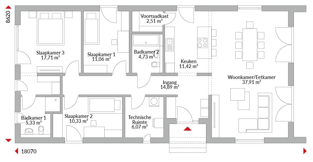 Bungalow met drie slaapkamers, entree en hal, technische ruimte, open woon-/eetkamer met toegang naar buiten en aangrenzende keuken, hoofdslaapkamer met en-suite en inloopkast, familiebadkamer, opslagruimte.