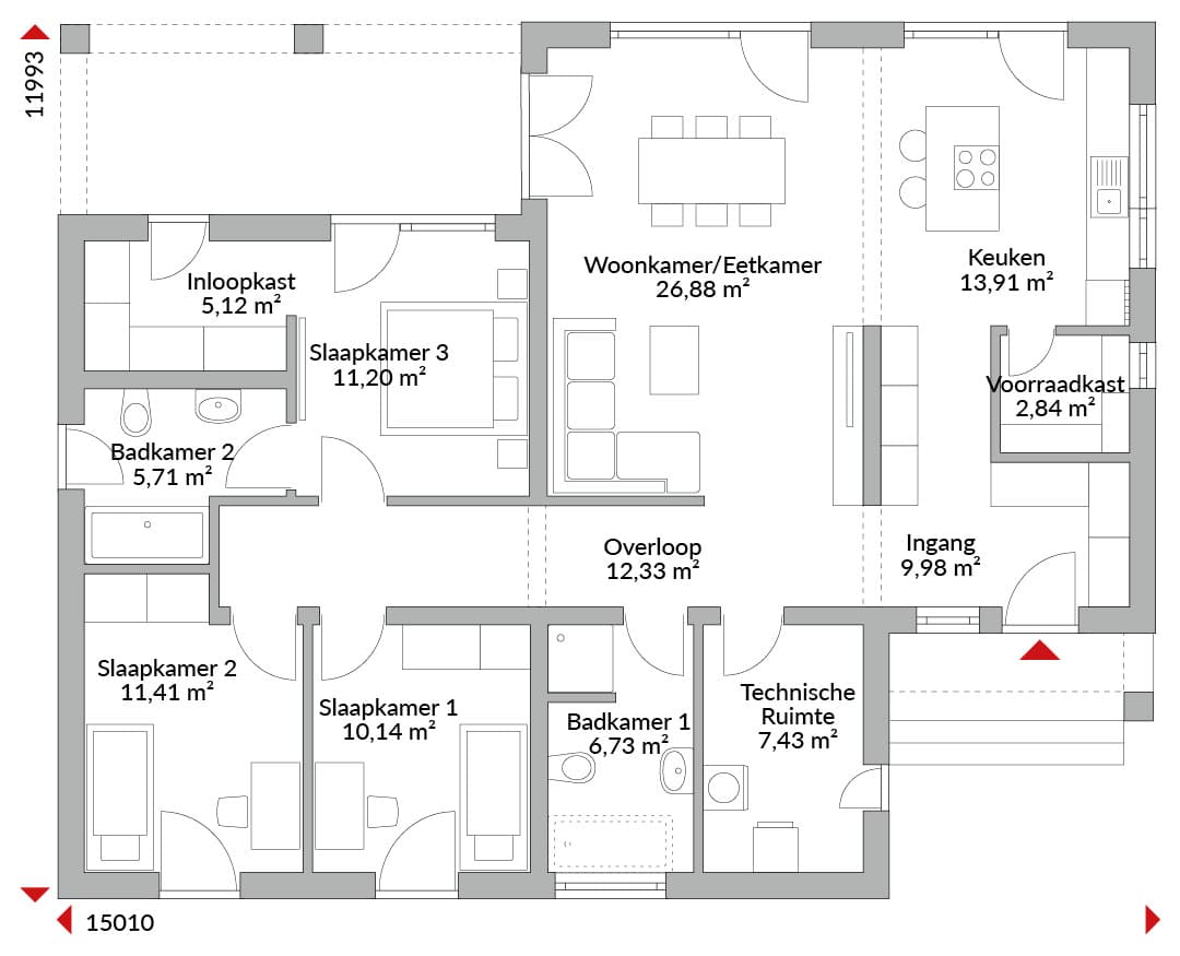 Bungalow met drie slaapkamers met garderobe, en-suite badkamer met ligbad, hal, open woon-/eet-/keukenruimte, voorraadkast, badkamer met douche, technische ruimte en zadeldak met een dakhelling van 25°.