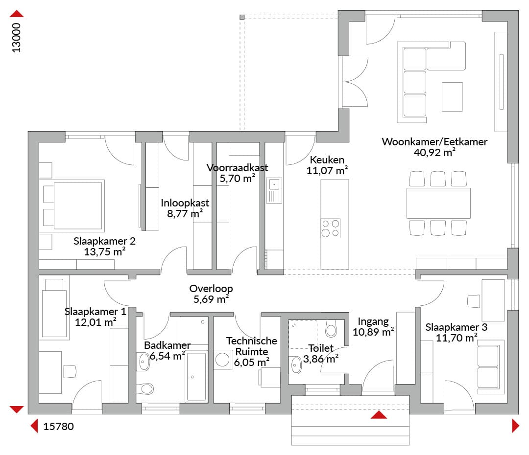 Drie-slaapkamer L-vormige bungalow met inloopkast, open keuken, pantry, badkamer, gastentoilet, technische ruimte, entree en gang. Geïntegreerde overkapping bij entree en terras. Schilddak met een dakhelling van 25°