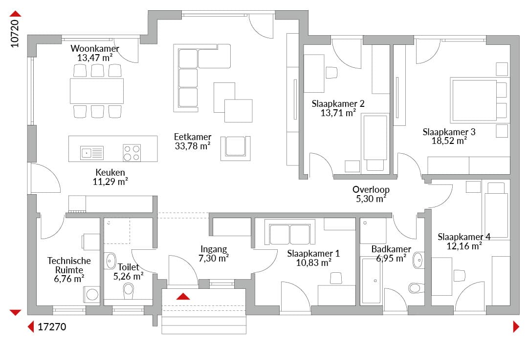 Vier-slaapkamerbungalow met een derde gevel, open keuken, badkamer, gastentoilet, technische ruimte, entreegebied en hal. Geïntegreerde luifel boven de entree. Zadeldak met een helling van 22°.