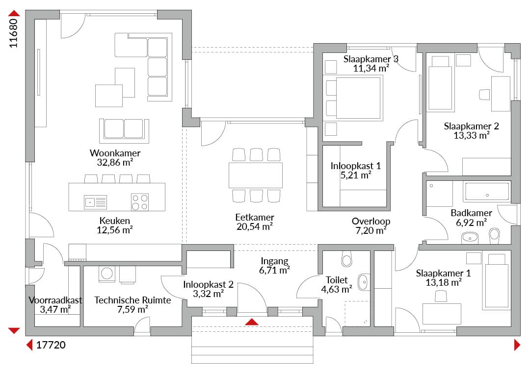 Bungalow met drie slaapkamers, inloopkast, garderobe, open keuken, voorraadkast, badkamer, gastentoilet, technische ruimte, entree en gang. Geïntegreerde overkapping bij entree en terras. Schilddak met een dakhelling van 25°