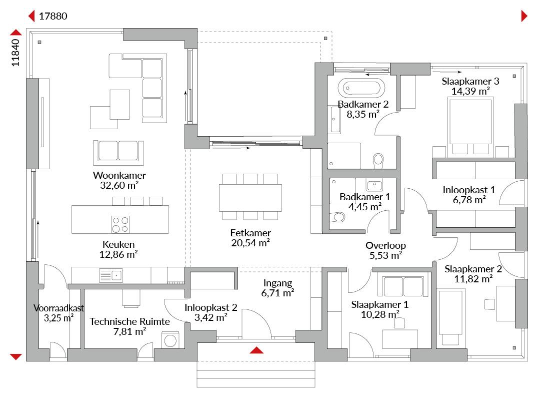 L-vormige bungalow met drie slaapkamers en geïntegreerde overkapping boven de verhoogde voordeur met zijramen. Hoofdslaapkamer met en-suite badkamer, voorzien van een vrijstaand bad, dubbele wastafel en douche. Er zijn twee aparte garderoberuimtes, waarvan één kan worden ingericht als inloopkast. Verhoogde leefruimte met hoekbeglazing en hoge ramen, ontworpen als een open keuken-, woon- en eetruimte met schuifdeuren naar het terras. Voorraadkast, gastentoilet met douche, technische ruimte, entree en gang. Schilddak met brede dakoverstekken (60 cm) en een dakhelling van 22°, inclusief een overkapping van het terras.