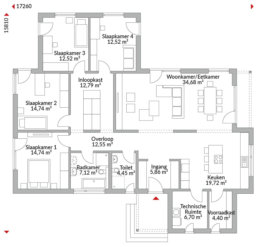 Vier-slaapkamer L-vormige bungalow met open keuken, badkamer, gastentoilet (optionele douche), entree, gang, garderobe en technische ruimte. Schilddak (inclusief overkapping bij de entree) met een dakhelling van 25°.