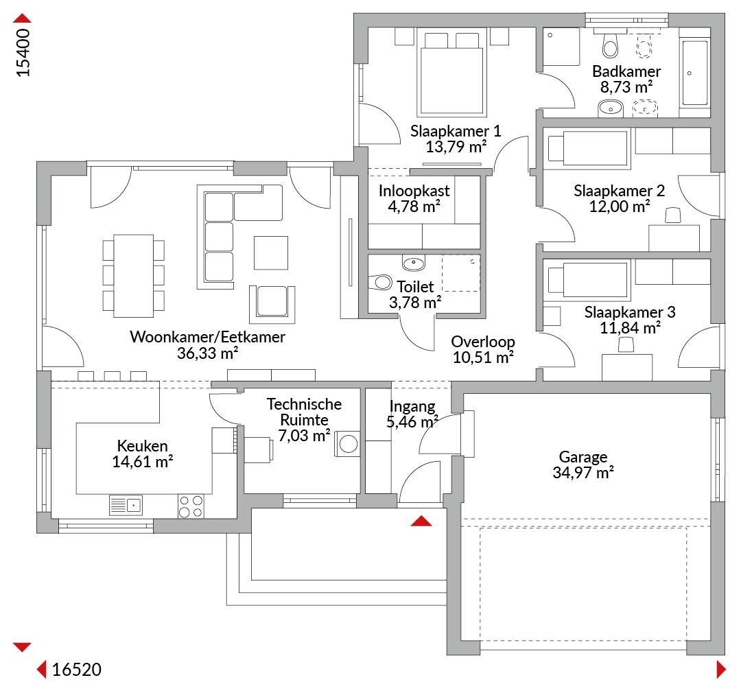 Drie-slaapkamer L-vormige bungalow met geïntegreerde garage, inloopkast, open keuken, badkamer, gastentoilet, technische ruimte, entree en gang. Geïntegreerde entreeoverkapping. Schilddak met een dakhelling van 25°
