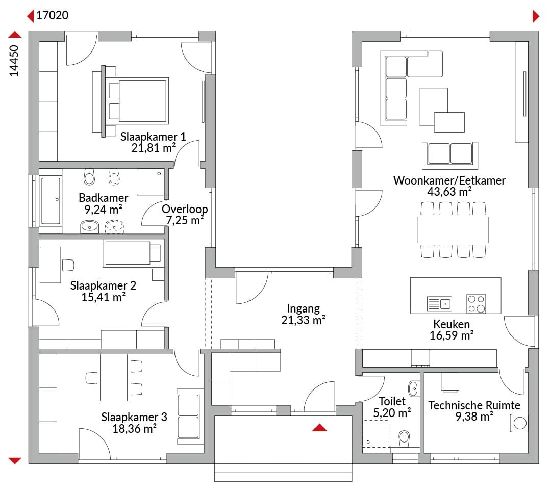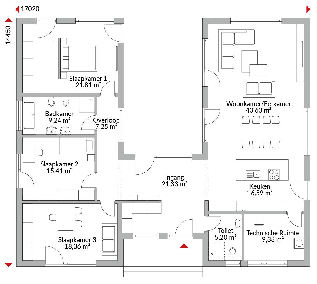 Drieslaapkamer bungalow in U-vorm met garderobe, open keuken, badkamer, gastentoilet, technische ruimte, entree en gang. Geïntegreerde entreeoverkapping. Combinatie van plat dak en lessenaarsdak (0°/22° helling).