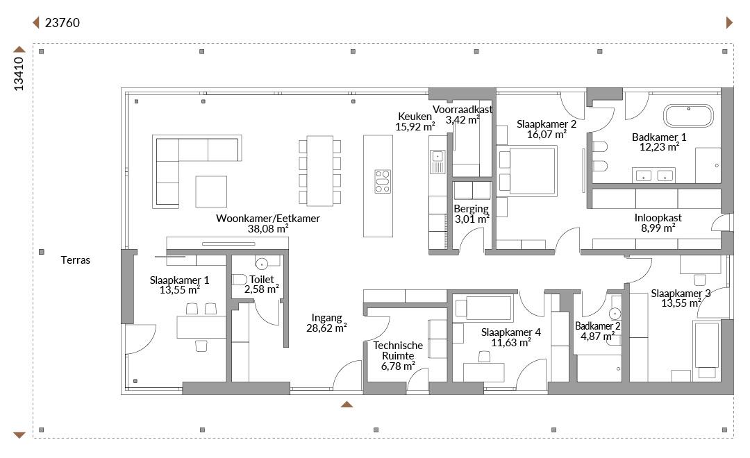 Een ruime bungalow in loftstijl met bijna de helft van de wanden van glas - dat is pure luxe! Een prachtige combinatie van een ruimtelijk interieur, terwijl je toch dicht bij de natuur woont. De entree verwelkomt je met een royale hal, waar een nis is met een gastentoilet en een plek om jassen, laarzen en schoenen op te bergen.