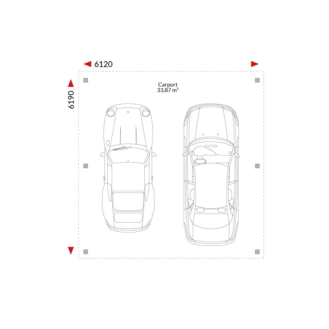 Carport 33,87 m² – Dubbele carport met lessenaarsdak, 5,82 m x 5,82 m (buitenafmetingen).