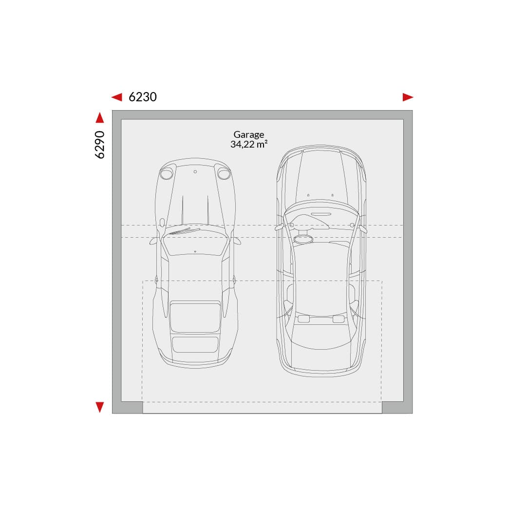Dubbele garage met een eenzijdig hellend dak (34,22 m²); buitenafmetingen 6,23 m x 6,29 m.