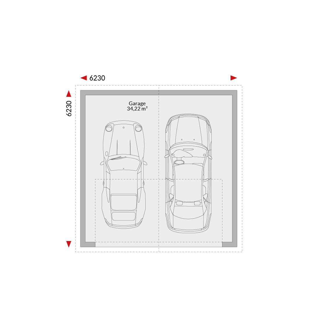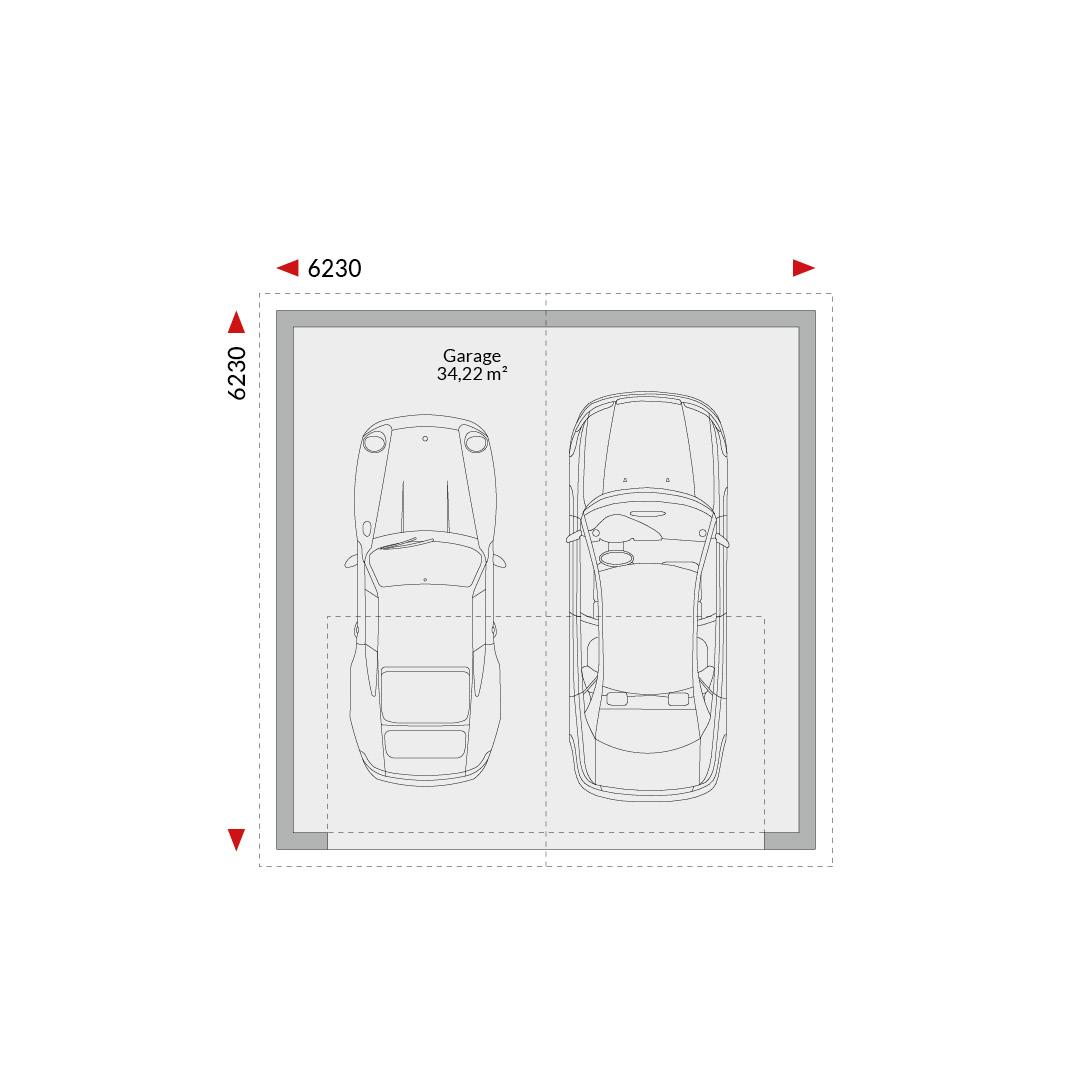 Dubbele garage (34,22 m²); zadeldak met toegang tot de nok; buitenafmetingen 6,23 m x 6,23 m.