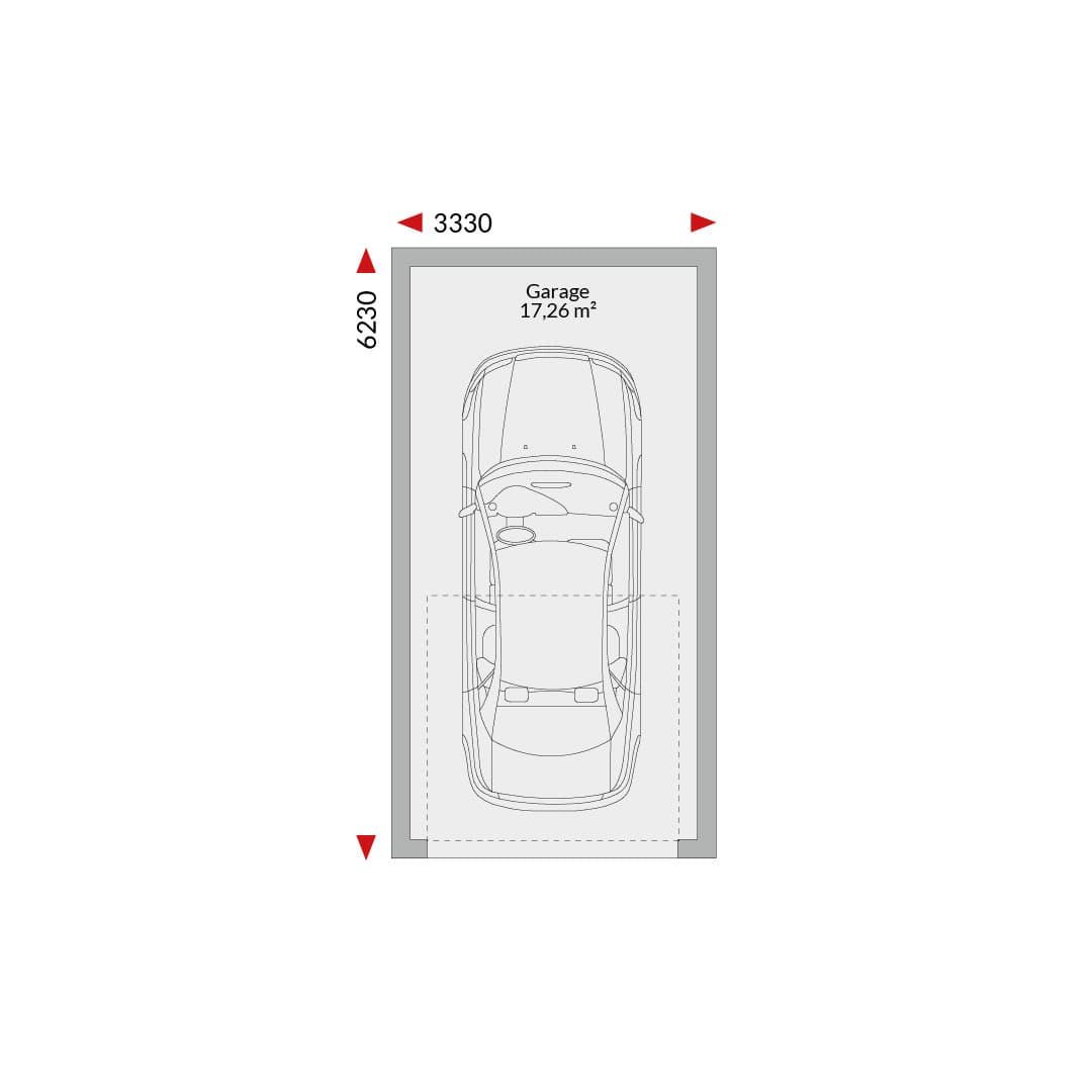 Enkele garage met plat dak (17,26 m²); buitenafmetingen 3,33 m x 6,23 m.