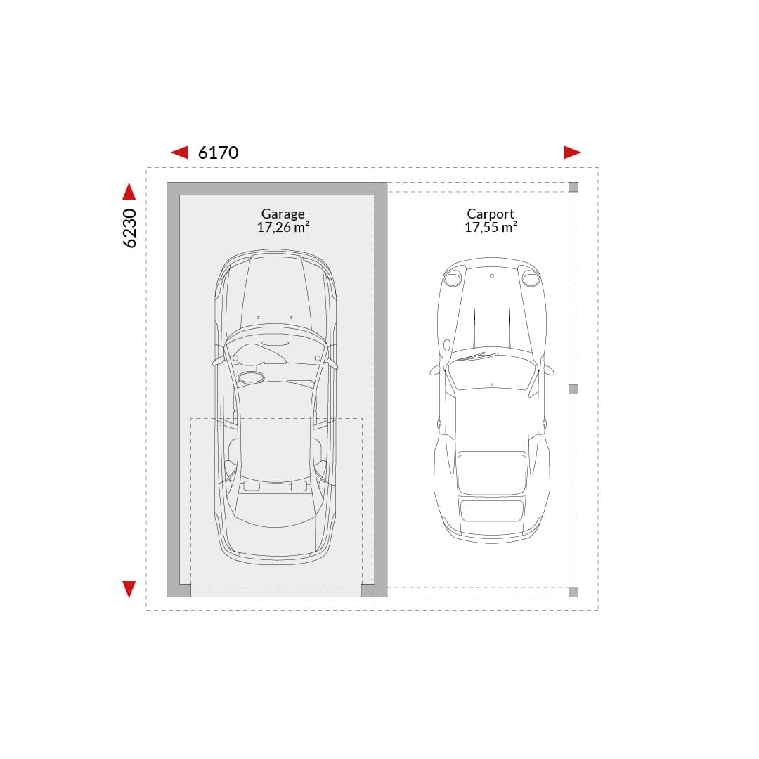 Enkele garage met carport (34,81 m²); zadeldak met toegang tot de nok; buitenafmetingen 6,17 m x 6,23 m.