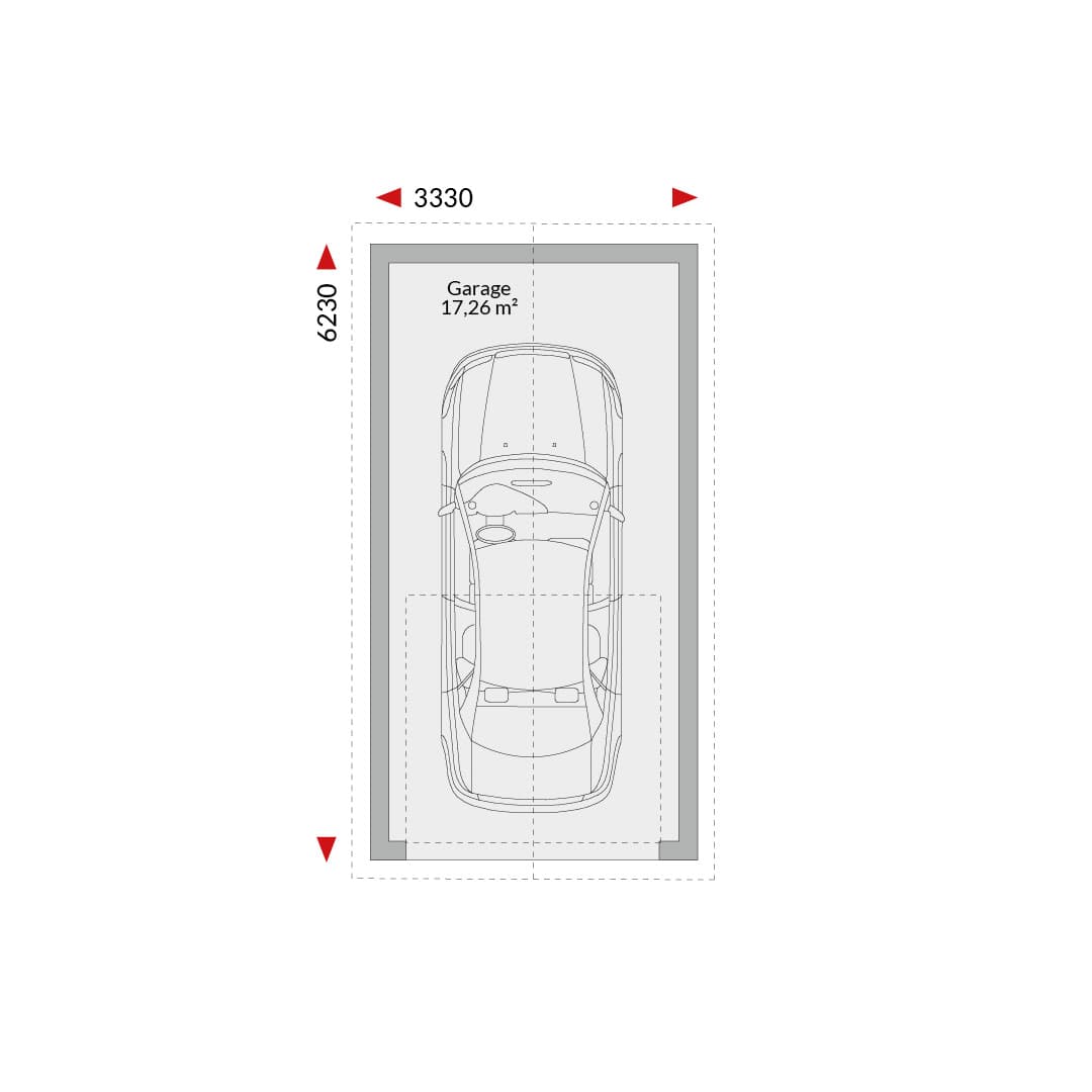 Enkele garage (17,26 m²); zadeldak met toegang tot de nok; buitenafmetingen 3,33 m x 6,23 m.