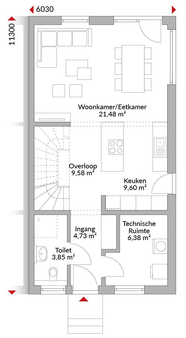 Halfvrijstaand huis met anderhalve verdieping, vier slaapkamers, inloopkast, keuken, badkamer, gastentoilet, technische ruimte en entreehal. Zadeldak met een dakhelling van 40°. Knieschothoogte: 1,25 m.