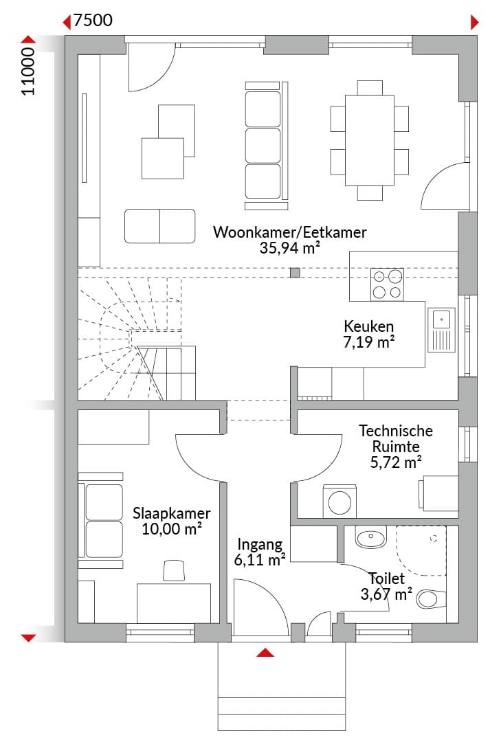 Halfvrijstaand huis met anderhalve verdieping, vijf slaapkamers, keuken, badkamer, gastentoilet, technische ruimte en entreehal. Zadeldak met een dakhelling van 40°. Knieschothoogte: 1,00 m. Dakkapel met zadeldak.