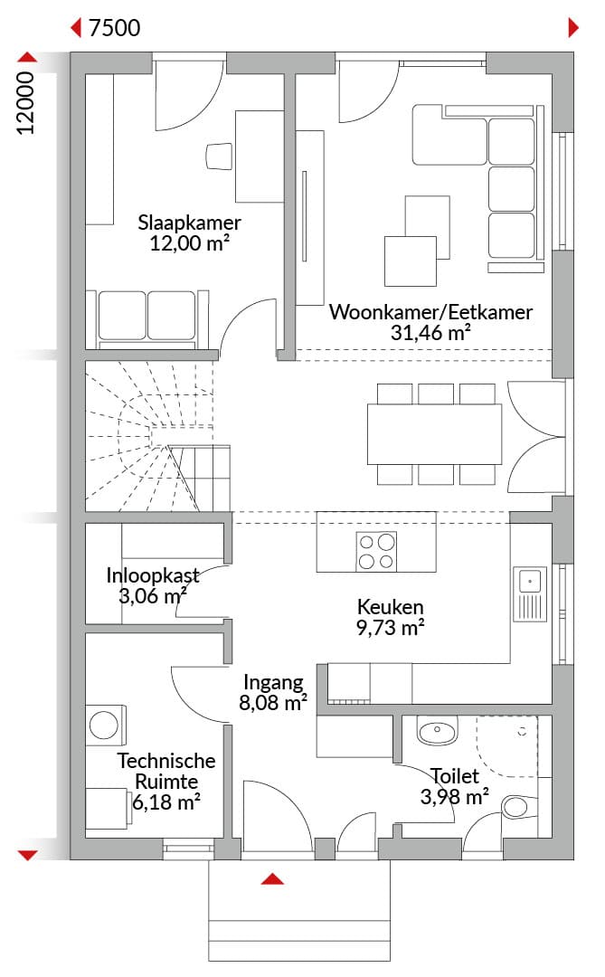 Halfvrijstaand huis met anderhalve verdieping, zes slaapkamers, keuken, badkamer, gastentoilet, technische ruimte en entreehal. Zadeldak met een dakhelling van 30°. Knieschothoogte: 1,50 m. Twee grote dakkapellen met platte daken.