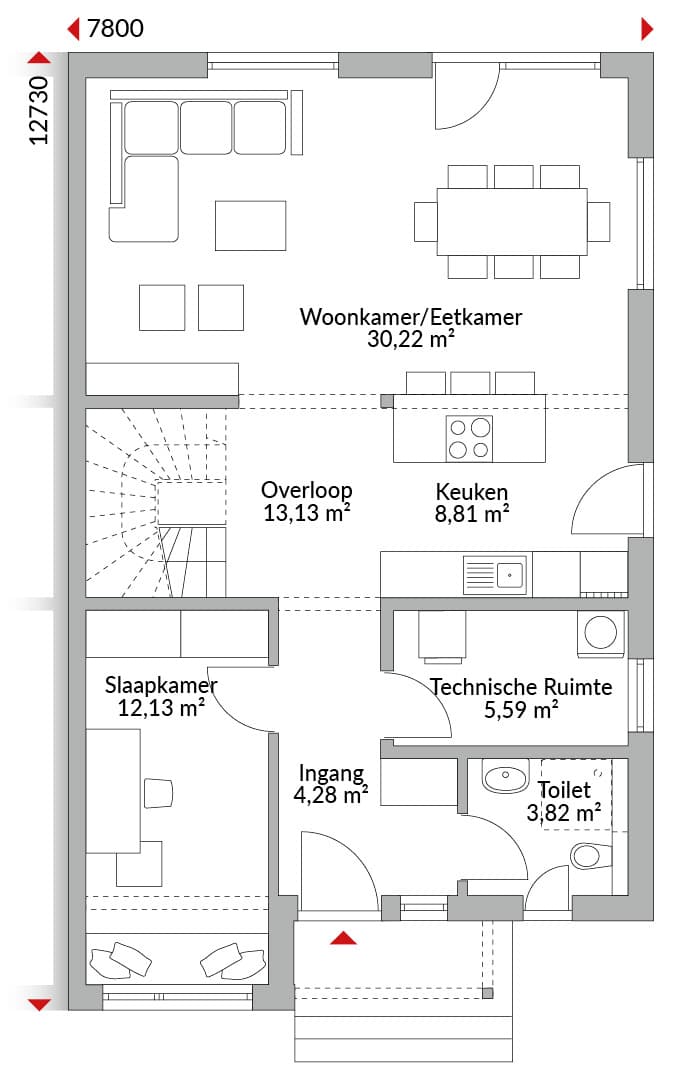 Halfvrijstaande woning met vijf slaapkamers, keuken, grote badkamer met T-vormige indeling, gastentoilet, technische ruimte en entreehal. Zadeldak met een dakhelling van 30°. Knieschothoogte: 1,75 m. Geïntegreerde entreeoverkapping met plat dak, plus achterste dakkapel met plat dak.
