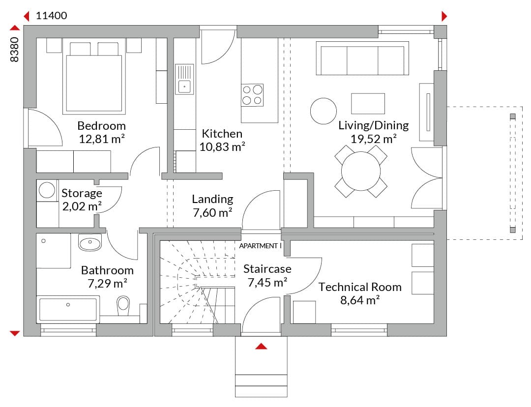 Gezamenlijke technische ruimte met aparte externe toegang voor beide appartementen.