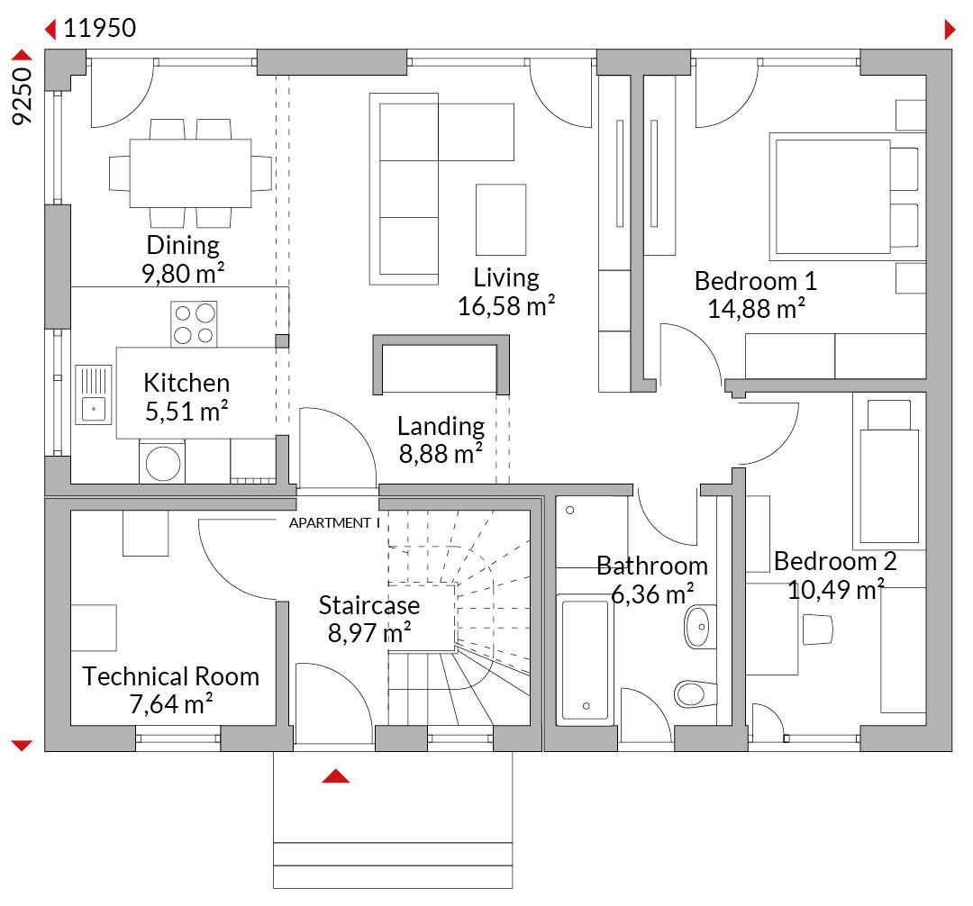 Gezamenlijke technische ruimte met aparte externe toegang voor beide appartementen.