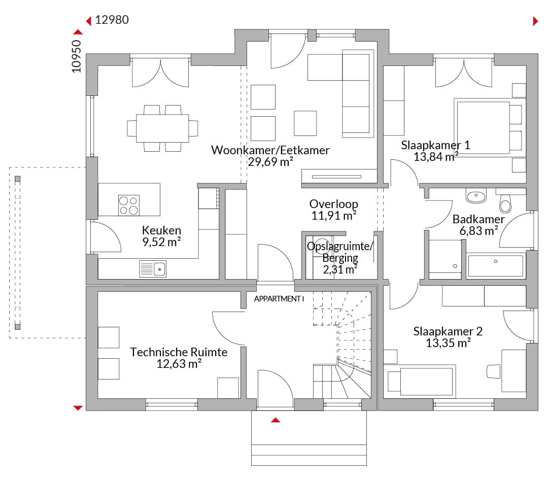 • Appartement 1 (begane grond): open keuken, ruime woon-/eetkamer, gang, technische ruimte, badkamer met ligbad, twee slaapkamers, overdekt terras.