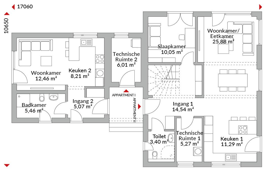 Gezamenlijke technische ruimte met aparte externe toegang voor beide appartementen.